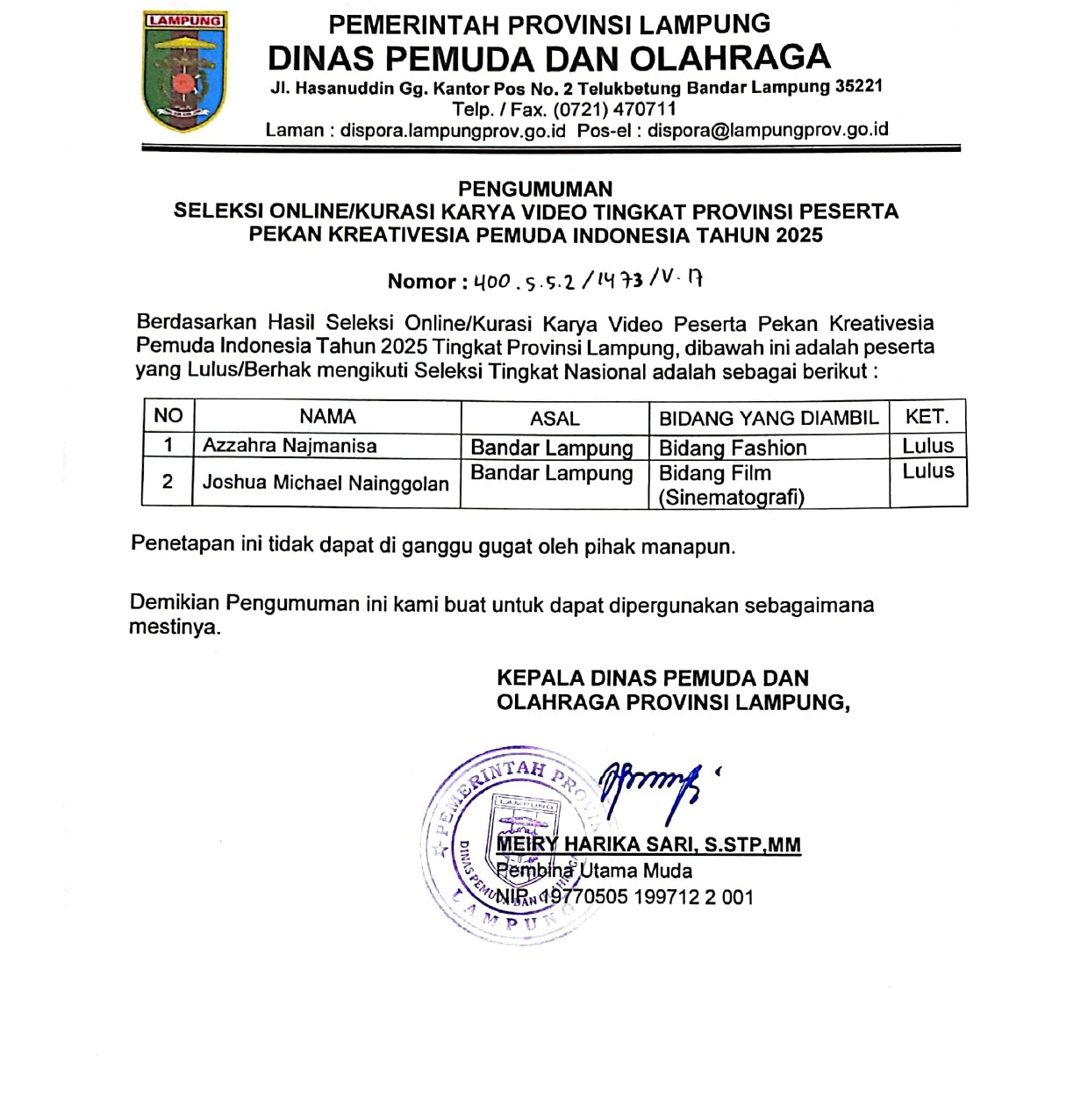 Bandar Lampung - Kepala Dinas Pemuda dan Olahraga Provinsi Lampung, Meiry Harika Sari, S.STP., M.M., menerima audiensi dari Kementerian Pemuda dan Olahraga Republik Indonesia (Kemenpora) di ruang kerjanya, Rabu (12/11/25).Rombongan Kemenpora yang had...